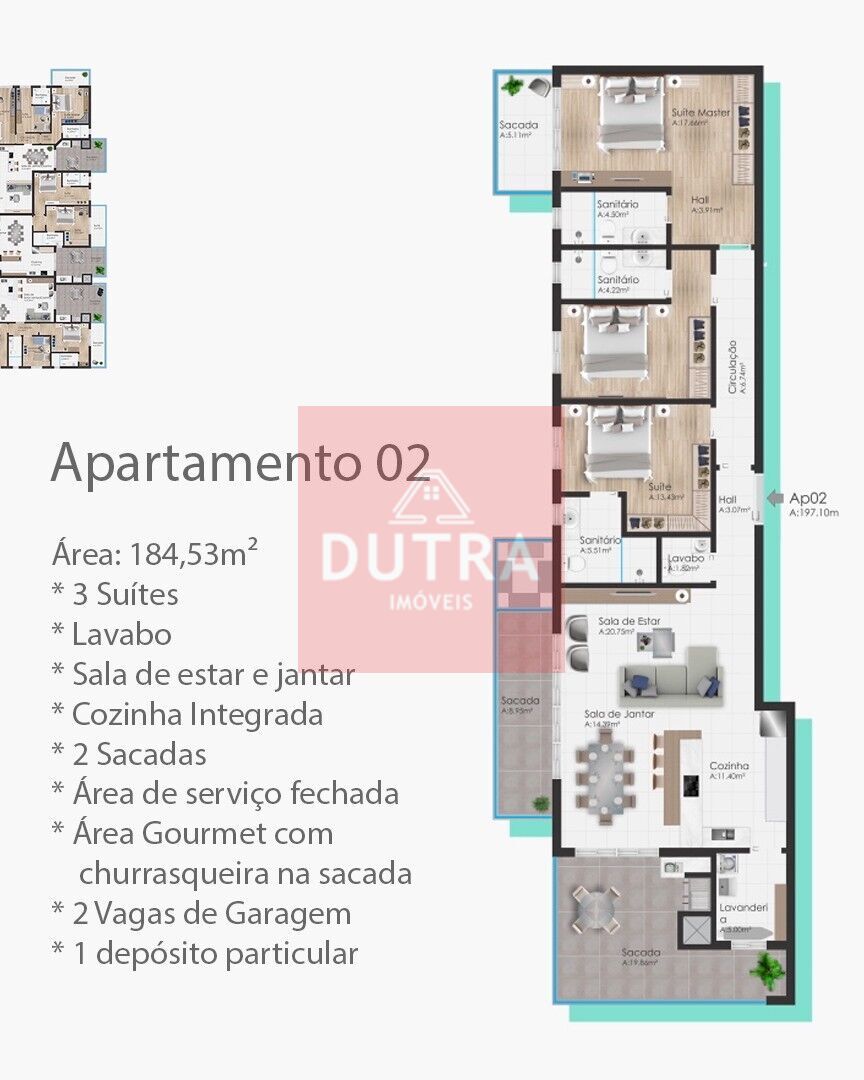 📐 Área construída de 199,39m², com ambientes amplos e muito bem distribuídos: 🛏️ 03 suítes espaçosas, 🛋️ Sala ampla e elegante, 🌇 Sacada, 🍽️ Cozinha moderna, 🚿 04 banheiros, 🧺 Área de serviço e 🚗🚗 Garagem para 02 carros.